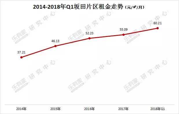 当然,企业也为坂田带来了大批租客,促进了租房市场的发展。从2014年37.21元/㎡/月的租金,到2018年一季度的60.21元/㎡/月,坂田租金上涨幅度达62%。换言之,2014年租客在坂田租一个35㎡的一房,需要1302元/月,如今需要2107元/月,一年下来要多交近万元的房租。