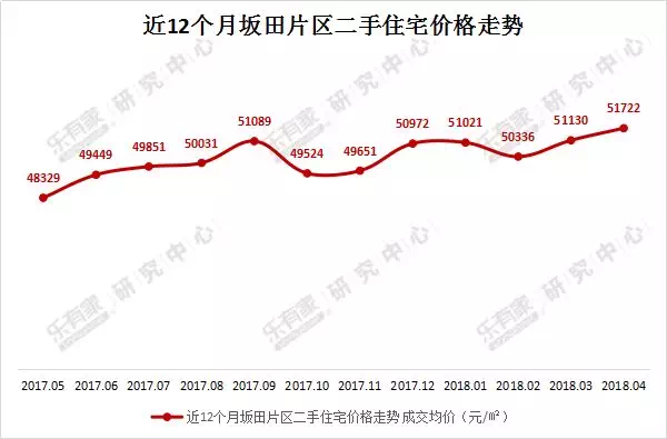 自2016年“104”新政开始,深圳全市一二手房价均处于平稳发展状态,坂田也不外如此。近12个月,片区二手住宅价格维持在5万元/㎡上下,全年涨幅7%。可以看出,虽然近一年华为撤离的传言屡次传出,但对于坂田的房价影响并不明显。