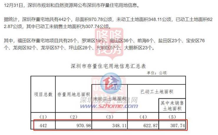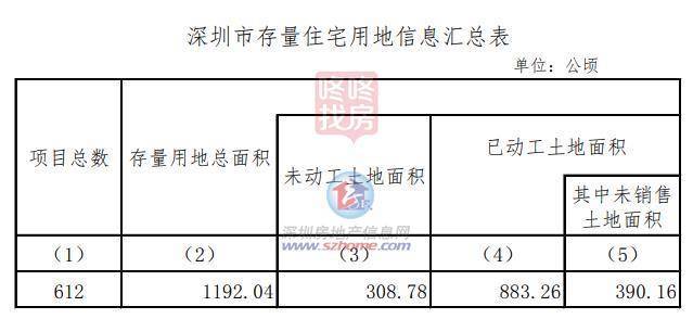 汇总表显示,深圳存量住宅项目612个,其中,普通商品房385个。存量用地总面积1192.04公顷,未动工土地面积308.78公顷,已动工土地面积883.26公顷(其中未销售土地面积390.16公顷)。