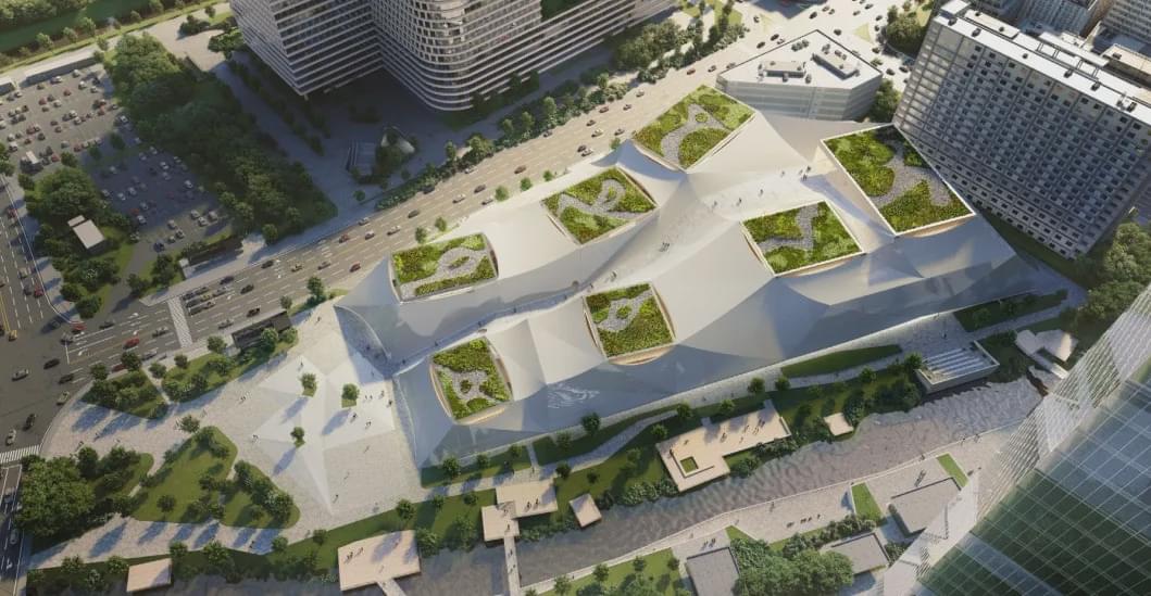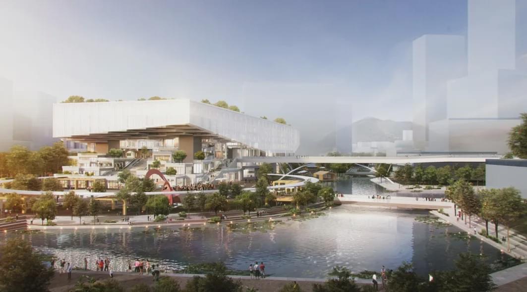该方案通过建筑、景观与城市设计的有机整合,成为深圳的文化客厅,在深圳高铁北站为龙华带来城市动力的基础上,引入人文和艺术的能量。建筑群如同龙安寺石庭,六块大小石块组成的绿台庭园,成为高层间隙中的文化净土,现代城市的山水理想。六栋建筑分别在周边的墙体形成结构体系与服务设施,承托六个柱状石块建筑之间的大跨距三维桁架与绿色平台。建筑群落缝合自然山水与城市肌理,组织巷道、河道与街道。建筑群落结合大尺度街廓,协调紧邻的交通枢纽、大型医院与城市更新,成为深圳北区和城市弹性成长,与自然生态永续共生的新文化空间。