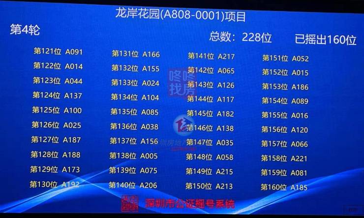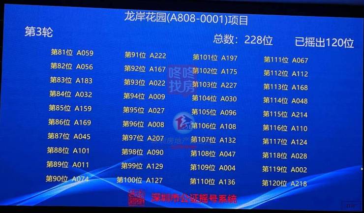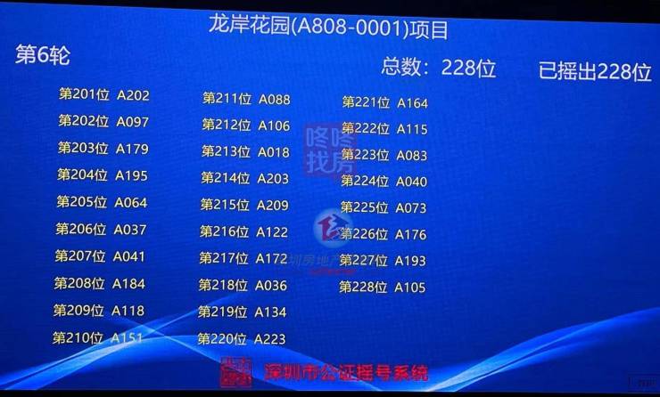 6月15日,金光华龙岸君粼(龙岸花园)登记人名册公示,此次共228批客户意向登记,项目于今日(6月16日)上午进行选房顺序号摇号。
